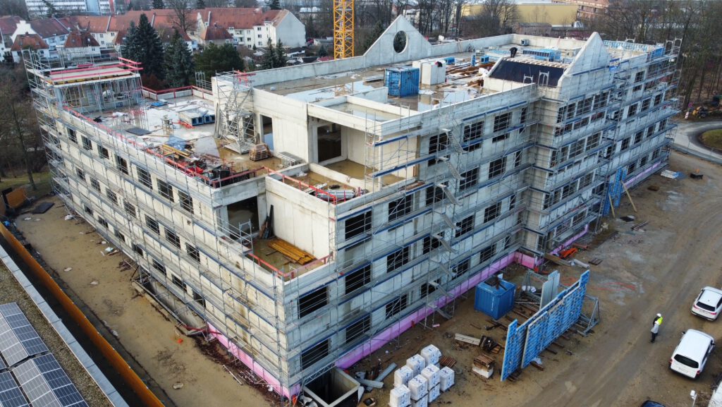 Der Bau liegt trotz witterungsbedingter Bauunterbrechung im Zeitplan. Der Rohbau soll Ende April/Anfang Mai 2026 planmäßig fertiggestellt werden.